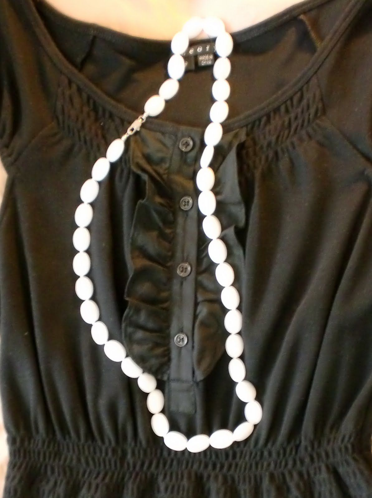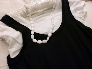 To add some white to my boring black surrender to the Establishment, I found a pretty white stone necklace at one of those Korean accessories emporiums while shopping on Melrose last weekend. They've become my new favorite thing. They're just the right kind of weight and length- long enough to dangle right above the navel, heavy enough to feel substantive but not so much that it feels like a fashion albatross.