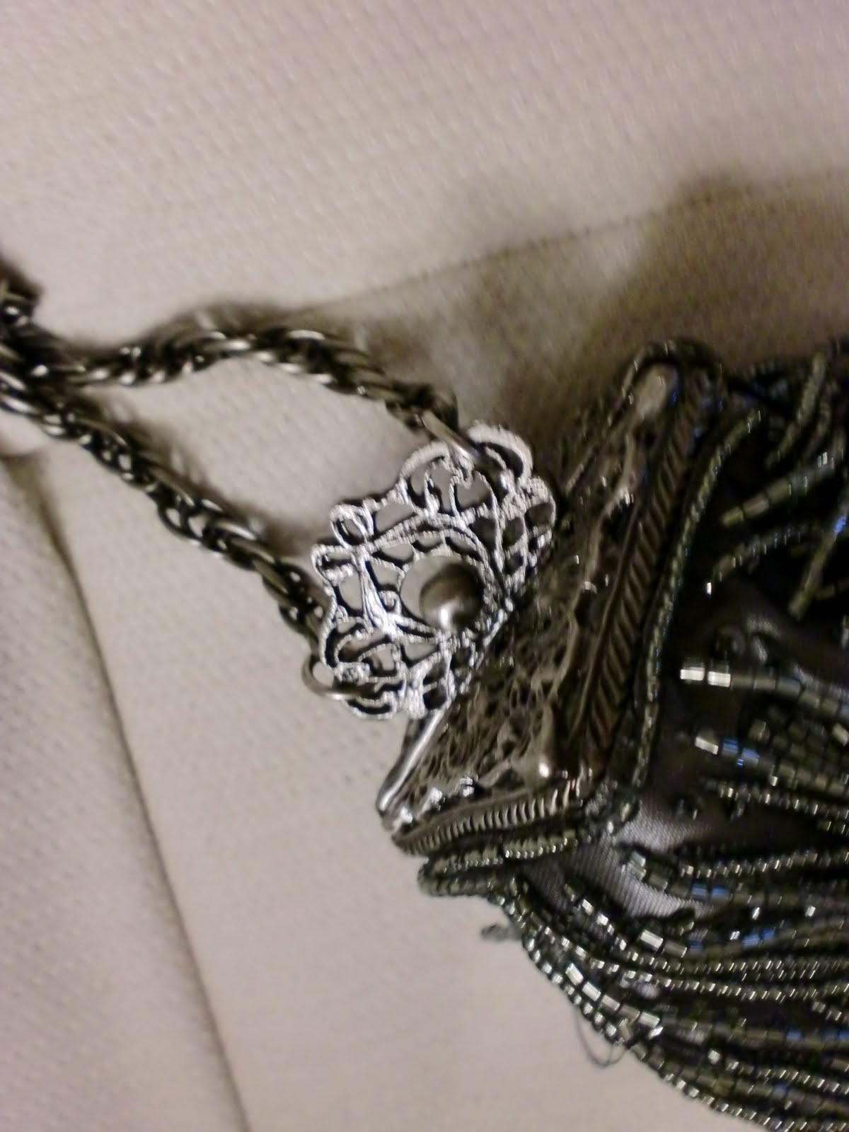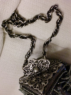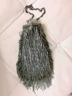 I don't carry very many clutches (yet another aside about my unglamorous life), but here's a delightful flapper number (Inge Christopher) I recently paired with a bronze Grecian dress.